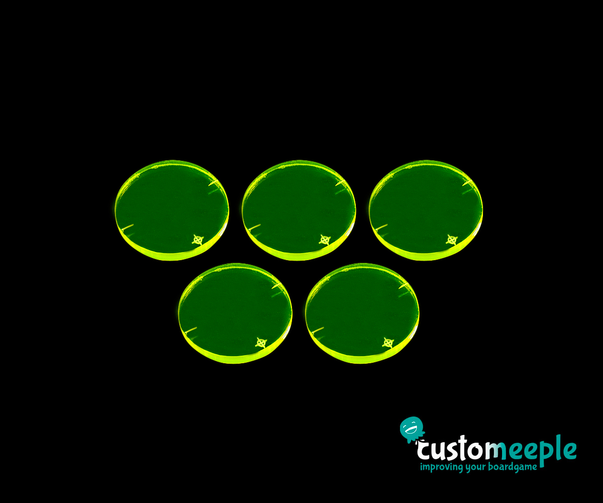 Un pack de bases de metacrilato fluorescente. Perfectas para resaltar que algunas miniaturas son del mismo cuerpo o ejercito o para que encajen con la combinación de colores que hayas usado para pintarlas. Además estas bases vienen marcadas con una marca de linea de visión utiles para muchos juegos.