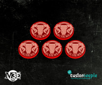 Un set de 5 marcadores para indicar tus argucias «scheme» completadas en Malifaux tercera edición.