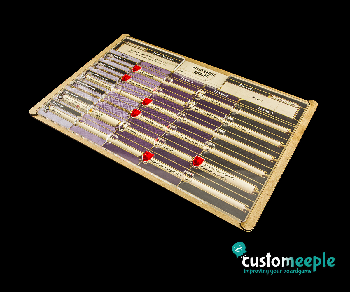 6 Pack of transparent acrylic overlay + colored acrylic markers + MDF base to make easier to keep track of your character and make games easier to play. The overlay has small holes to insert the markers to kept track of the skills.