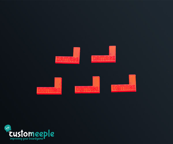 The damage and shield tokens are shaped like a set square, perfect to be attached in the edges of your cards, and making them easier to read.