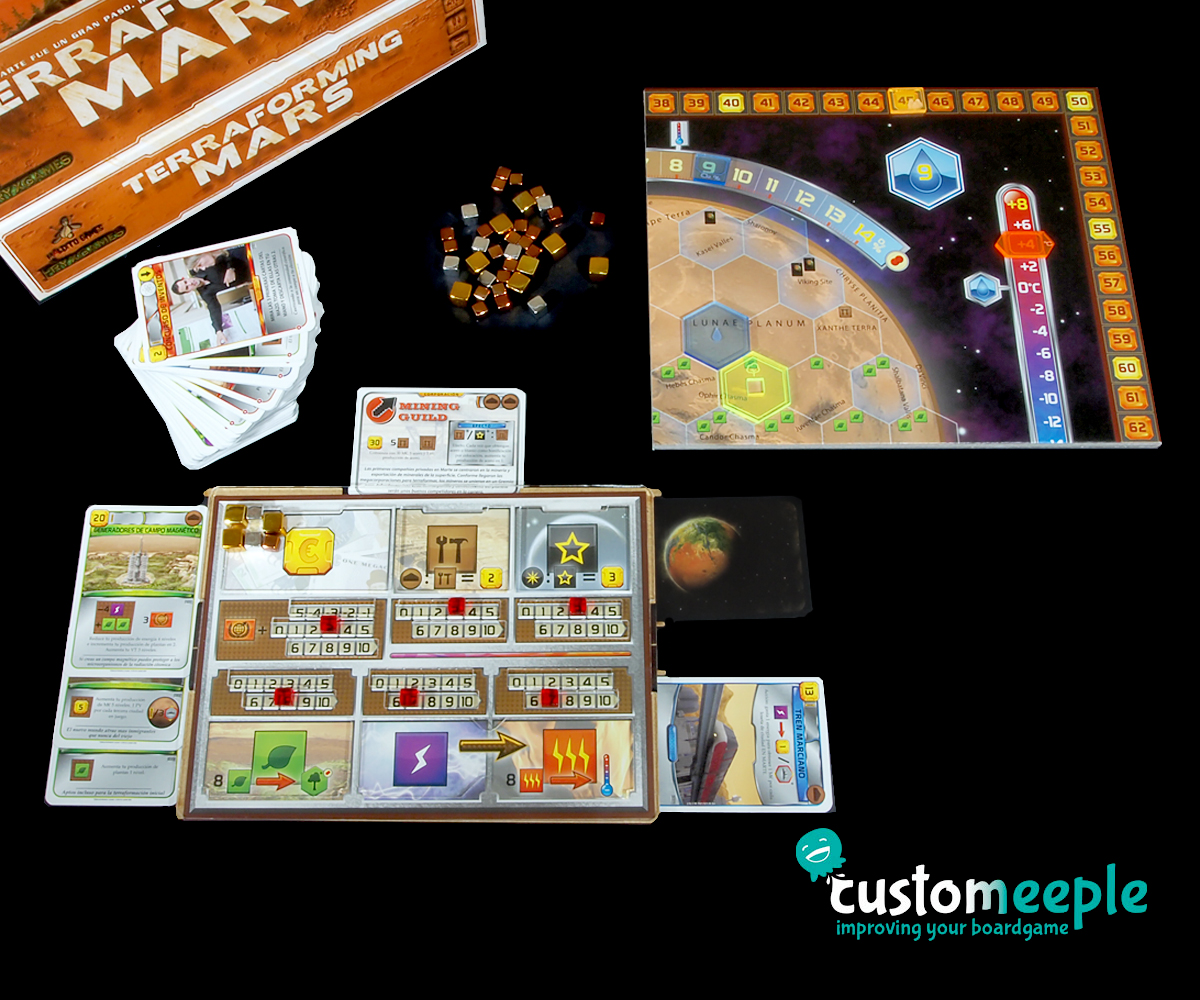 The pieces fits perfectly with the player mats and cubes for each player from the game Terraforming Mars
